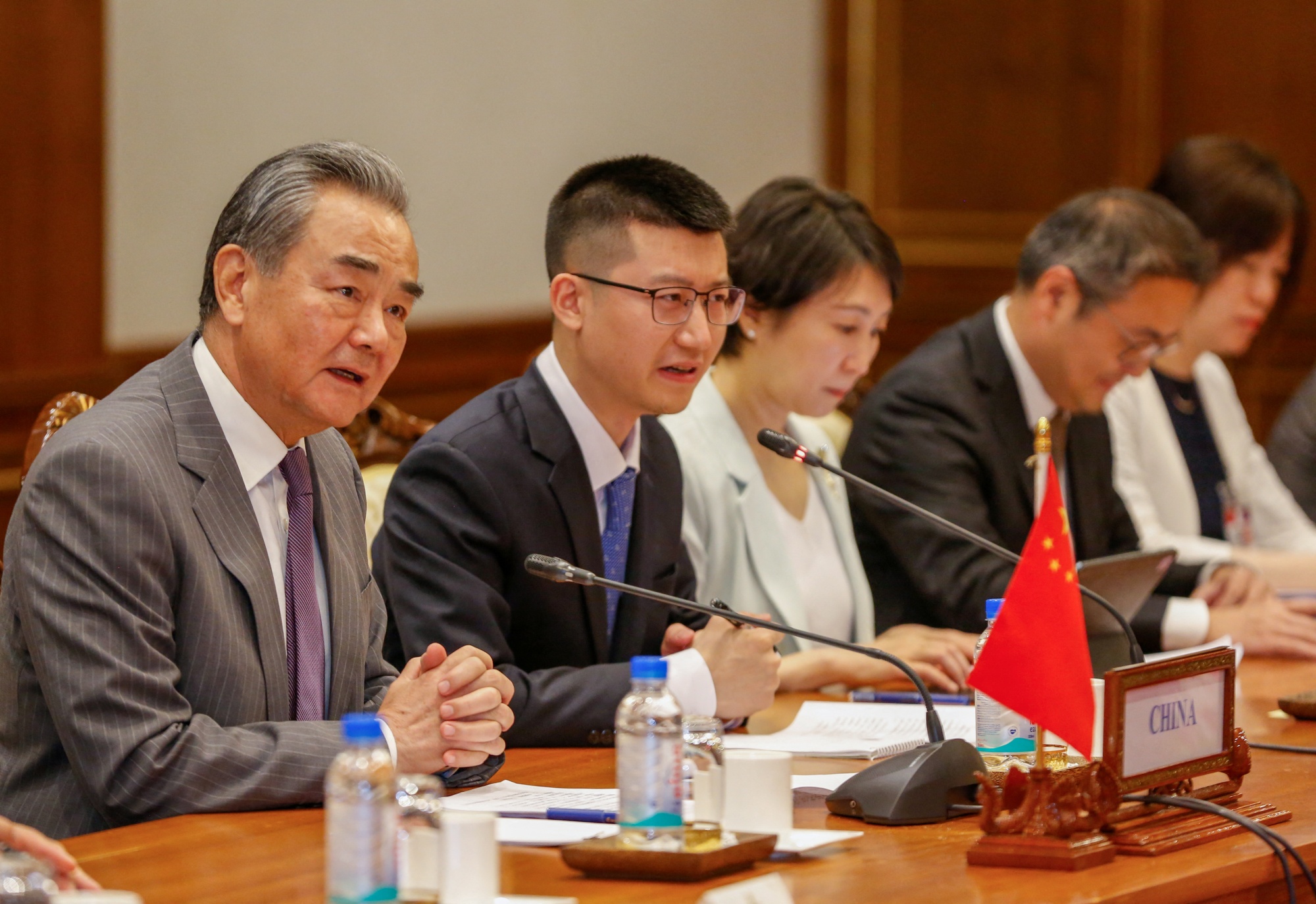 王毅,左,于4月21日在金边。