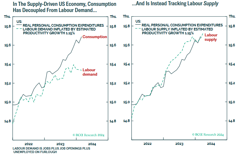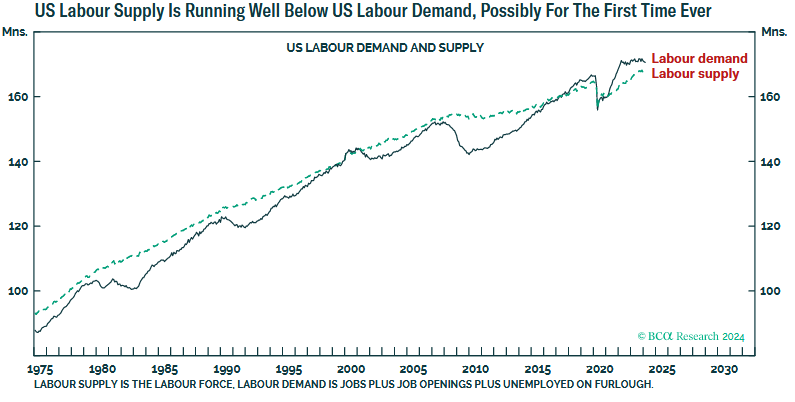 谜团的核心是就业市场,它拒绝变弱。BCA研究的Dhaval Joshi将这解释为雇主对劳动力需求与工人供给之间的不平衡。通常,需求是推动因素。疫情后,Joshi建议,供给较低: