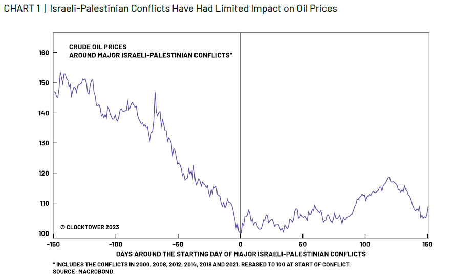 最重要的是,石油价格决定了冲突是否对市场产生负面影响。在哈马斯袭击之后的立即后果中,回报点发布了以下图表,由Clocktower Group的Marko Papic制作,他怀疑加沙的情况是否会对经济产生重大影响。之前的六次以色列-巴勒斯坦冲突对石油价格影响不大:
