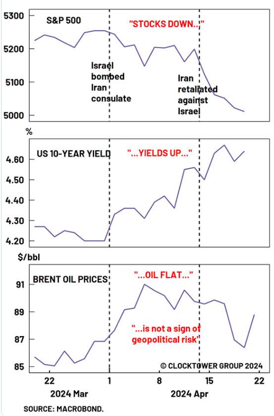 这场冲突会危及石油供应吗?胡塞人在海湾的航运中断,以及伊朗和以色列最近的火拼,可能会造成这种情况。但正如Papic所展示的,很难坚持认为以色列对伊朗领事馆的袭击,或者德黑兰的报复,会对市场产生反应。这是股票、国债和石油价格的表现: