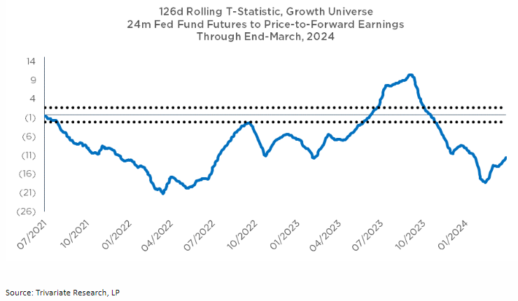 为什么这些伟大的公司最近表现不佳?特斯拉公司,以及远不及的苹果公司,都存在明显的个别问题。Trivariate Research的亚当·帕克指出,24个月联邦基金期货(对未来两年利率的看法)与成长股的前瞻市盈率之间存在强烈的负相关和统计显著关系。因此,今年对六七次联邦基金利率削减希望的破灭将给科技巨头带来问题: