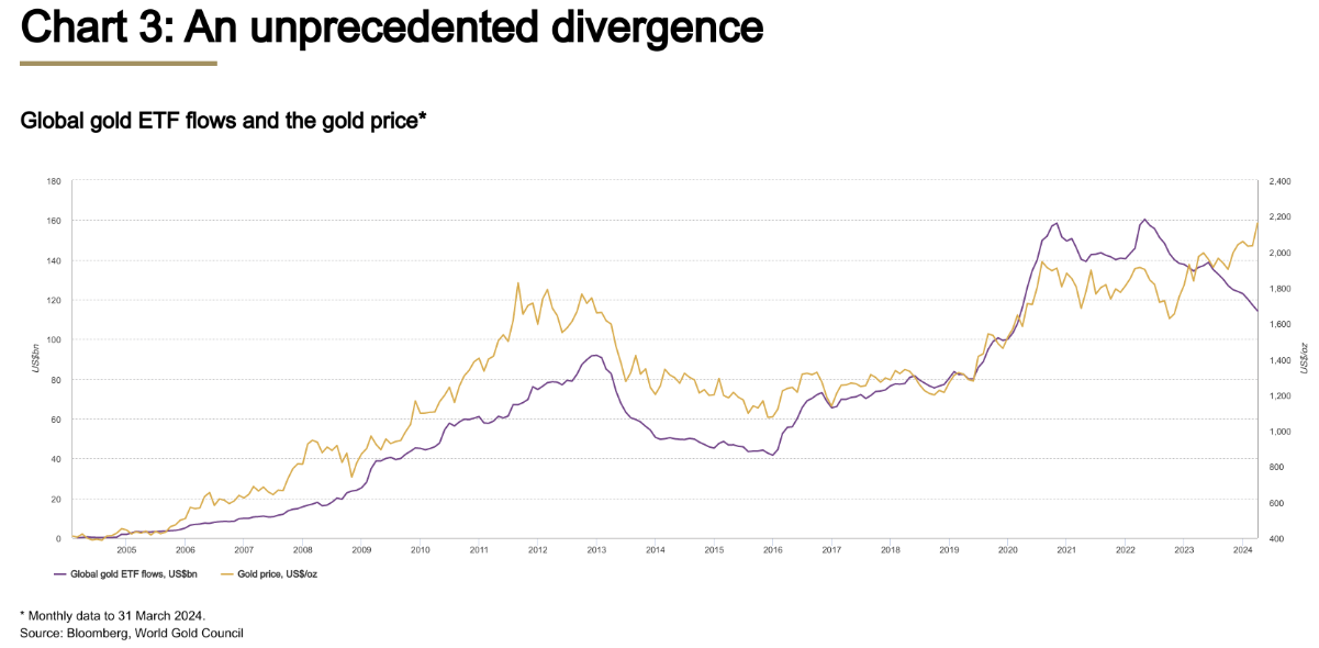 六个月前,随着美联储表示将摆脱长期高利率政策,这种分歧真正开始显现。这缓解了金融条件,使股市得以上涨,但黄金表明我们不应该相信这一点。或者,它可能在告诉我们更多地关注加沙问题,或者美国大选问题。
