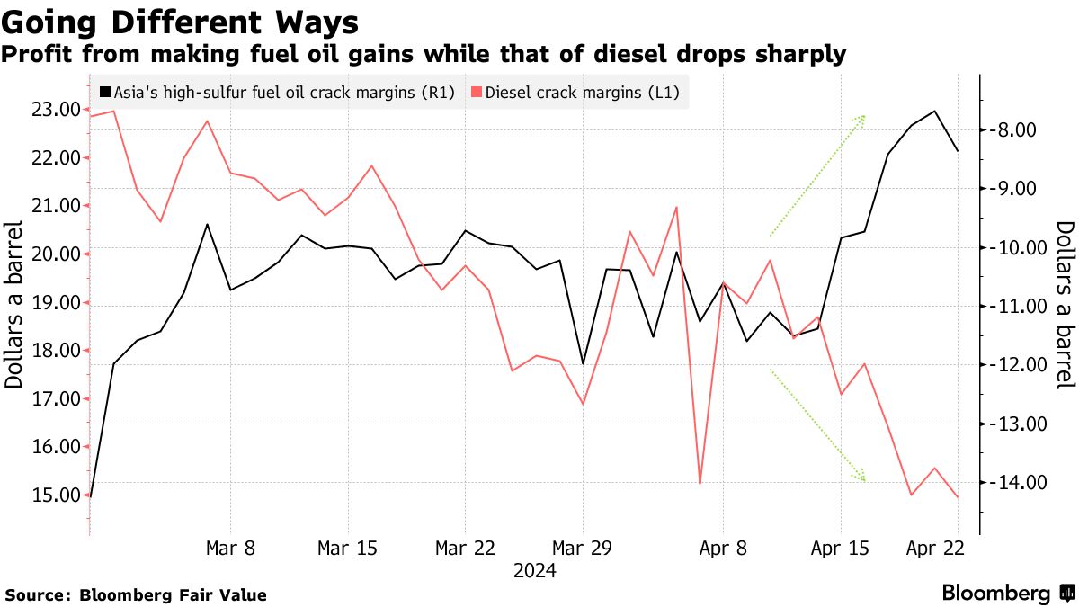 其他因素也在起作用,据交易商称。虽然柴油在全球范围内显示出疲软迹象,但由重质原油制成的燃料油却因季节性需求推动而获得提振,他们表示,中东在夏季消耗更多燃料油用于发电。