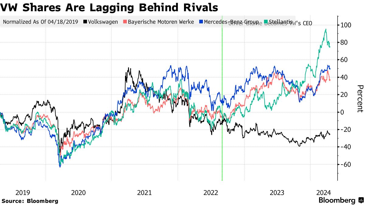 自从车型延迟和软件失误导致公司在2022年换掉首席执行官赫伯特·迪斯,由保时捷负责人奥利弗·布卢默接任以来,大众汽车一直未能摆脱负面的投资者情绪。在布卢默的领导下,这家汽车制造商与中国本土电动汽车制造商小鹏汽车合作推出其电动汽车型号,并启动了一项深层改革,以提高其陷入困境的大众品牌的回报率。