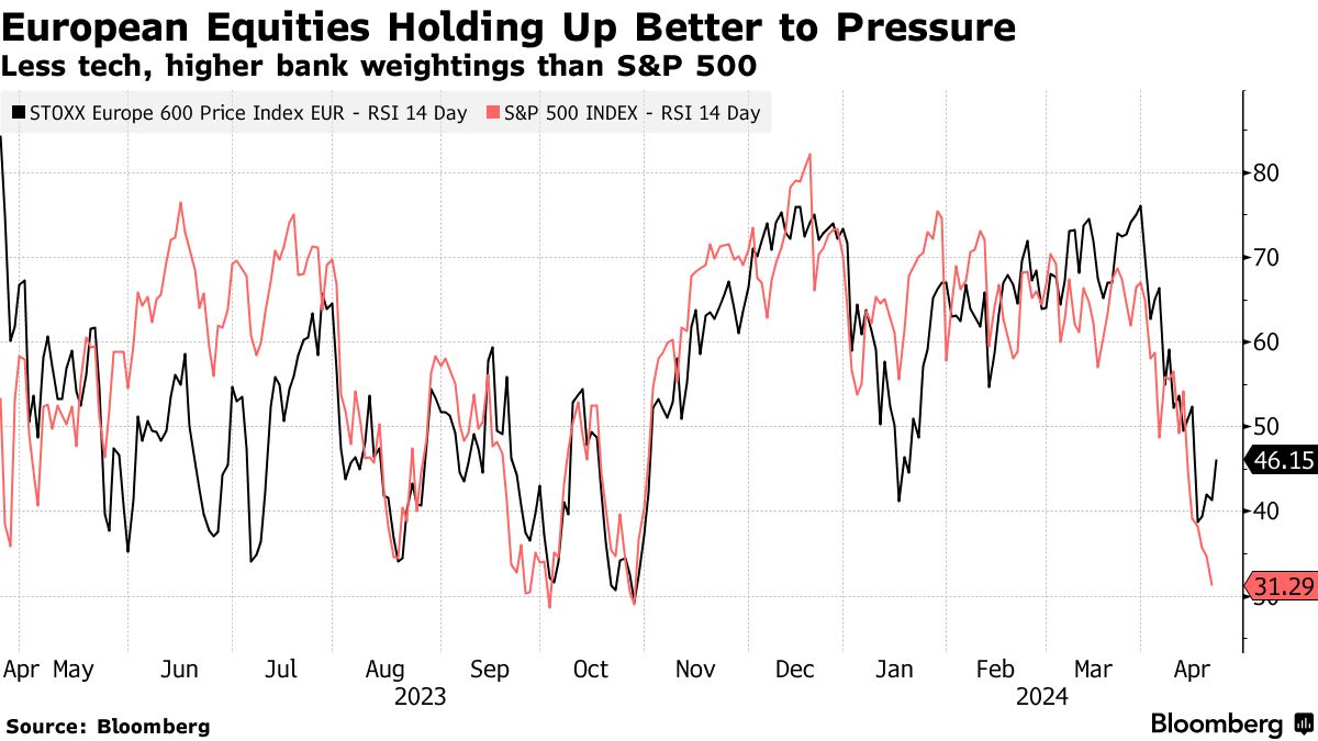 这种构成上的差异体现在动量读数中。标普500指数连续六天下跌,使得相对强弱指数(一种技术分析工具)接近超卖区域。相比之下,Stoxx 600指数在过去六天中上涨了四天,动量正在向更高处转移。