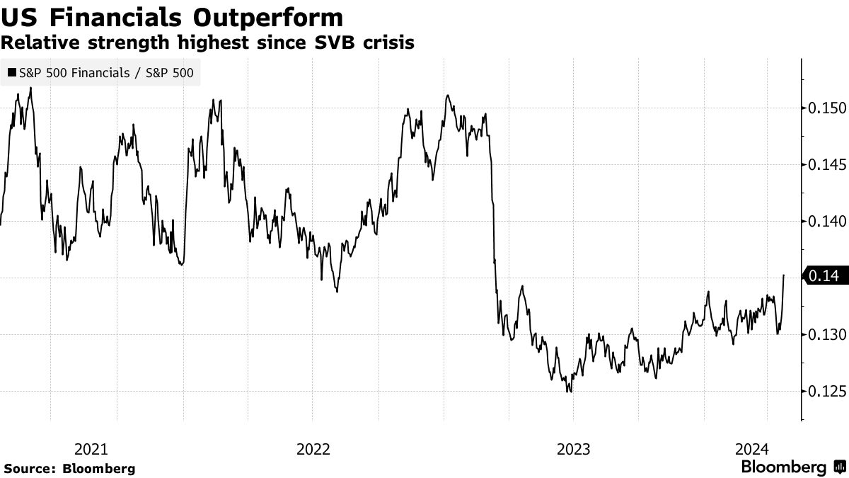 金融股在上周的最后三个交易日上涨,使其相对于整个市场的强势水平达到了自SVB危机以来的最高水平: