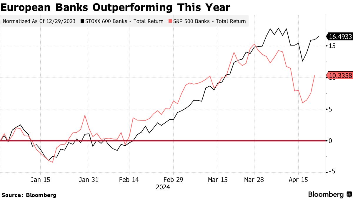 在欧洲,银行也将发布收益报告,巴克莱银行,德意志银行和法国巴黎银行将成为焦点。这个行业长期以来在市净率方面被低估,但2024年投资者开始青睐欧洲银行。