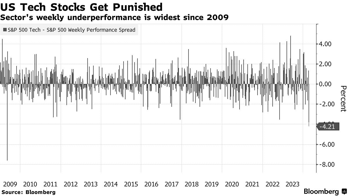 上周的抛售使得科技股表现不佳,自2009年以来表现最差,落后于标普500指数: