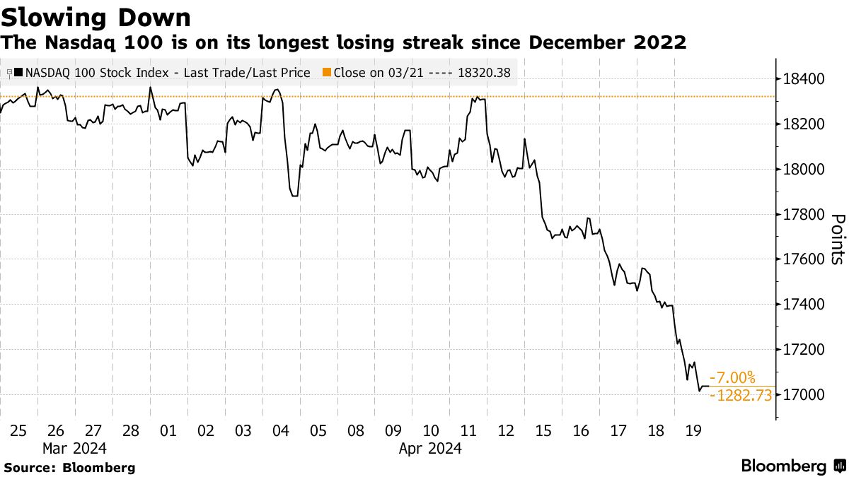上周科技股的抛售导致纳斯达克100指数录得17个月来最大的周跌幅。这一跌势使该基准指数的连续下跌延续至第四周 — 自2022年12月以来最长的一次。上周五,人工智能明星公司Nvidia暴跌10%,市值蒸发了2120亿美元。