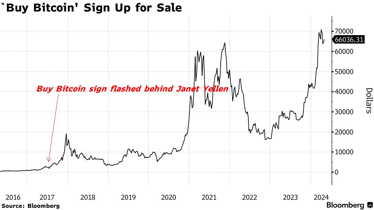 “买比特币”标志在珍妮特·耶伦身后闪现,接到了将近14万美元的出价 - 彭博社