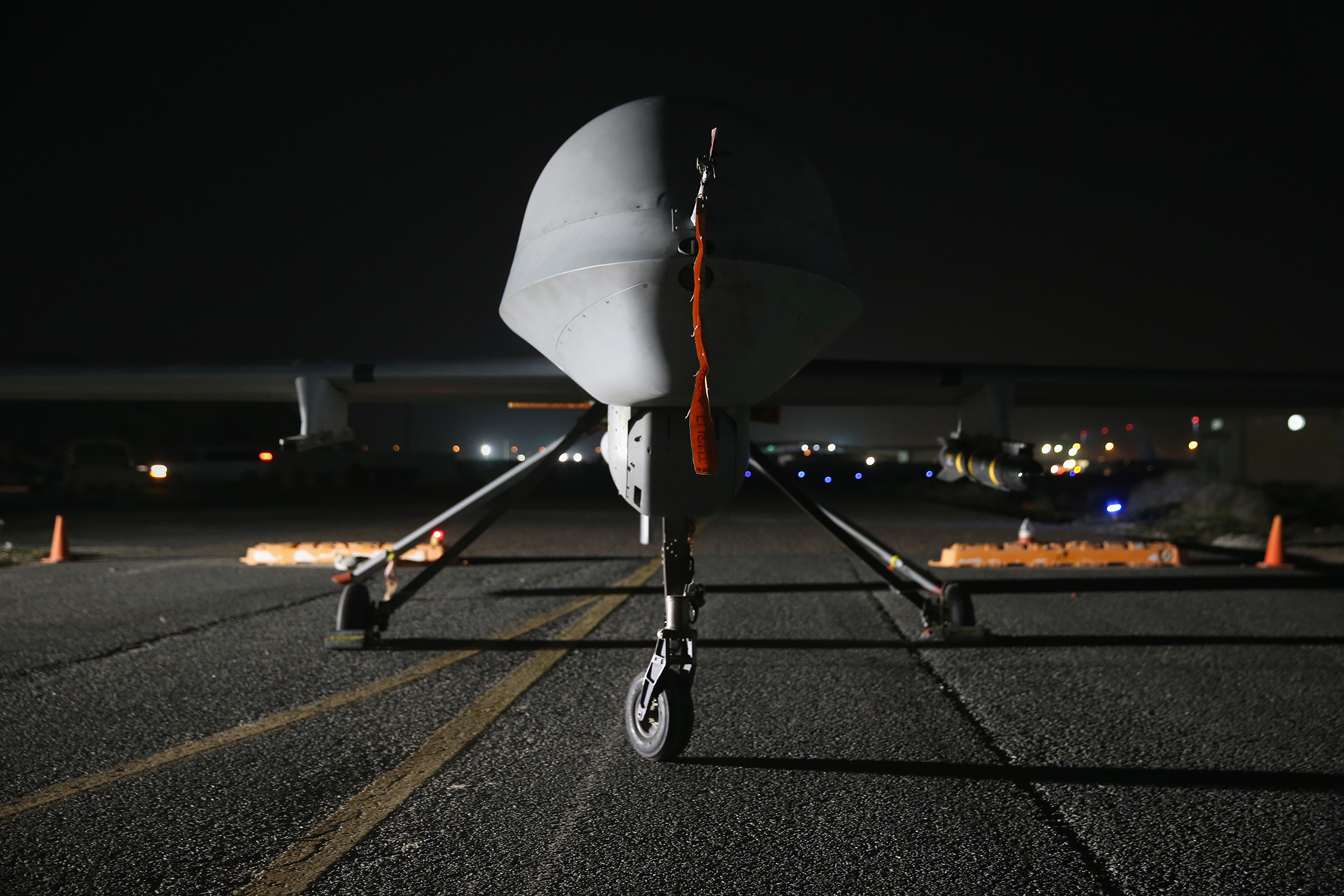 一架美国空军MQ-1B捕食者无人机(UAV)在波斯湾地区的一个空军基地。