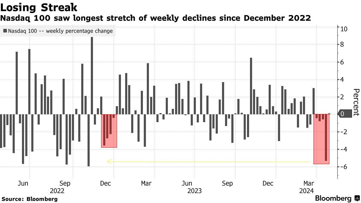 大科技公司的收益重点放在了Nasdaq 100指数在大约一年半以来的最糟糕一周,暴跌5.4%,让投资者担心利润是否足以扭转下跌趋势。这个科技股为主的基准指数在4月份下跌了6.5%,有望成为自2022年12月以来最糟糕的一个月。