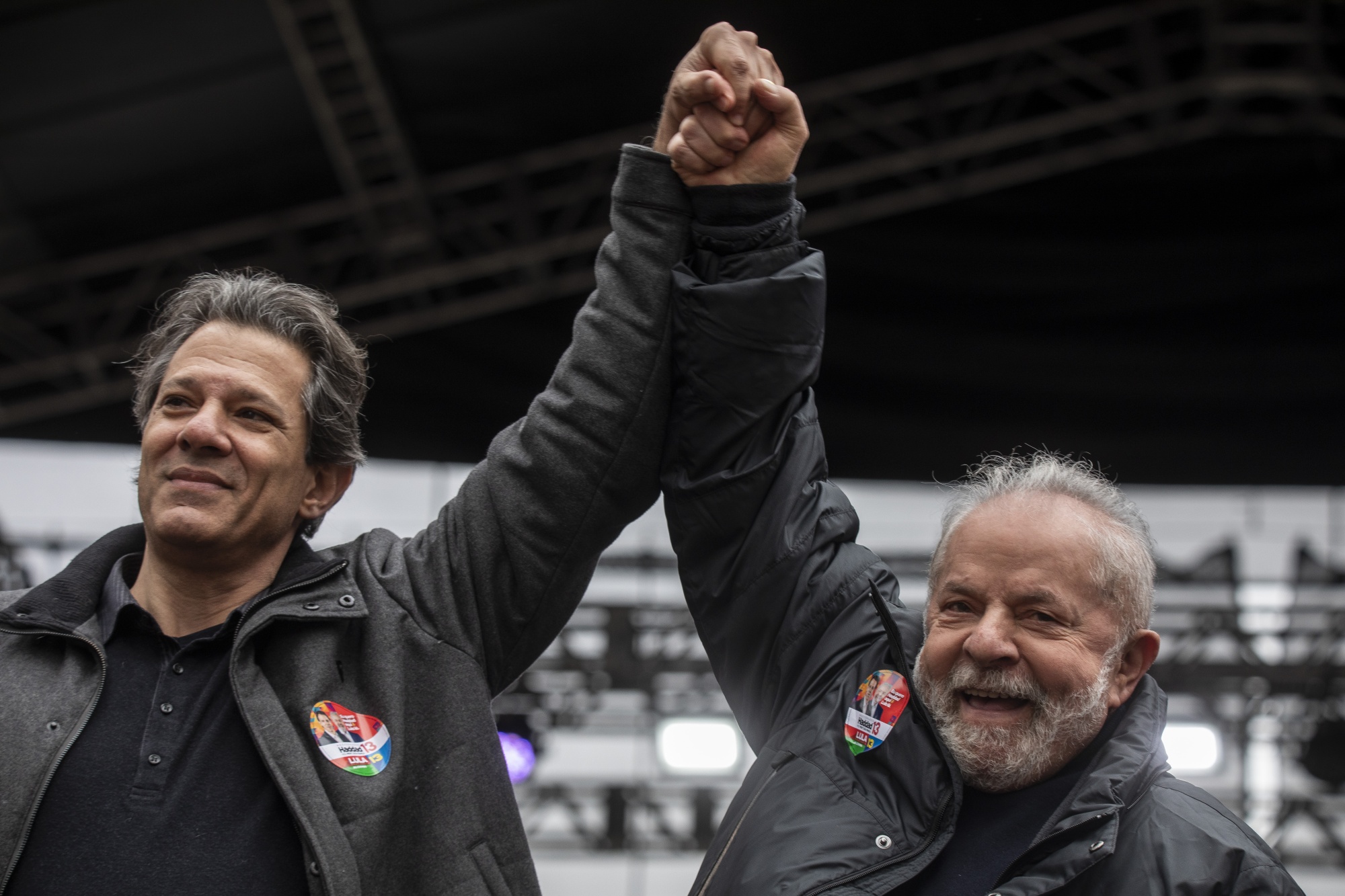 路易斯·伊纳西奥·卢拉·达席尔瓦(Luiz Inacio Lula da Silva)右,费尔南多·哈达德(Fernando Haddad),在2022年8月20日星期六在巴西圣保罗的一次竞选活动中。摄影师:Victor Moriyama/Bloomberg