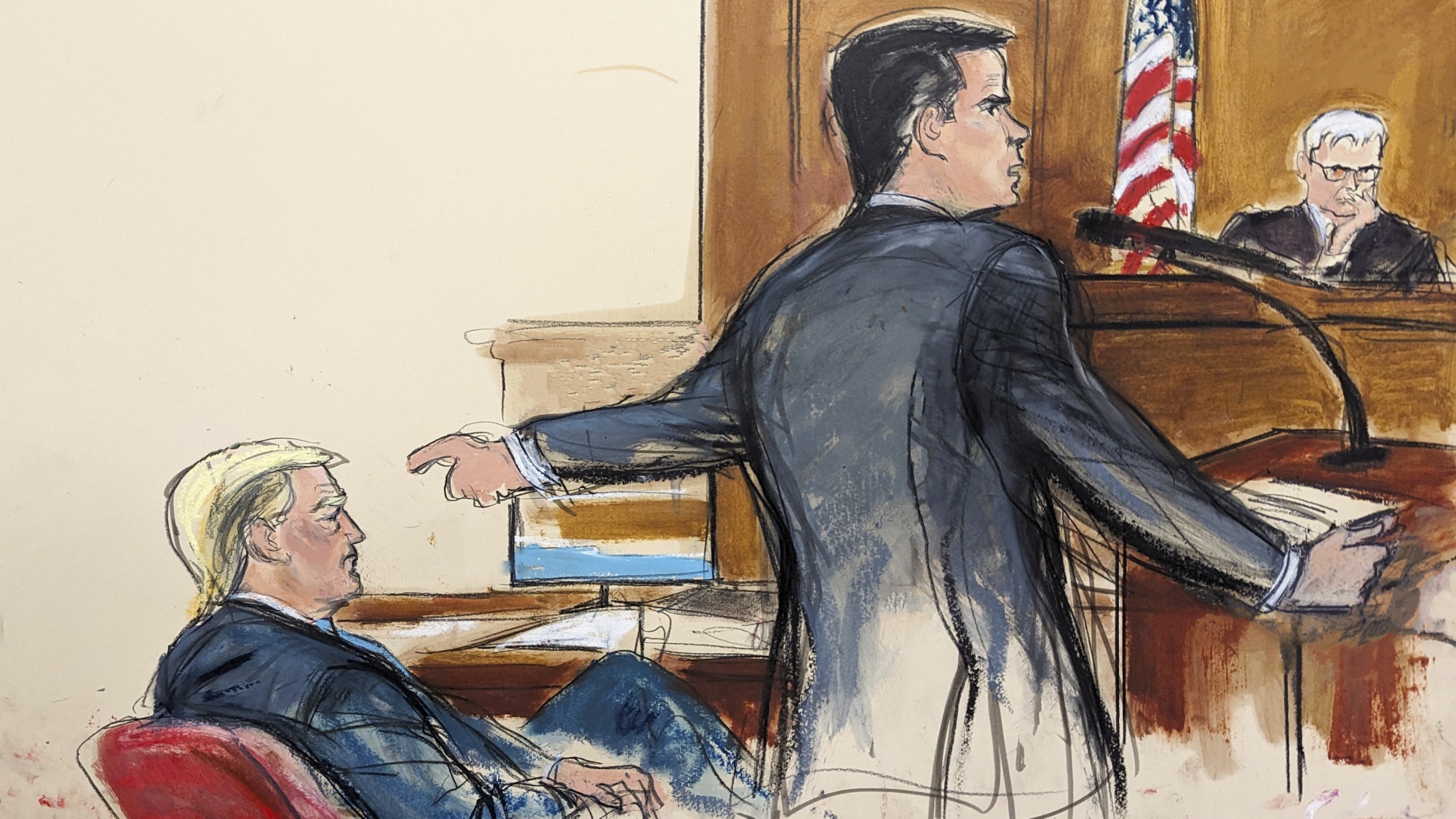 这幅艺术家描绘的画面显示了托德·布兰奇在曼哈顿刑事法庭向陪审团发表开场陈述时指着唐纳德·特朗普。摄影师:伊丽莎白·威廉姆斯/AP“他举起手,宣誓讲真话,然后说谎,作伪证,”布兰奇说。作为一名播客和书籍作者,科恩现在痴迷于特朗普,称“他的整个生计都取决于这种对特朗普的痴迷。”