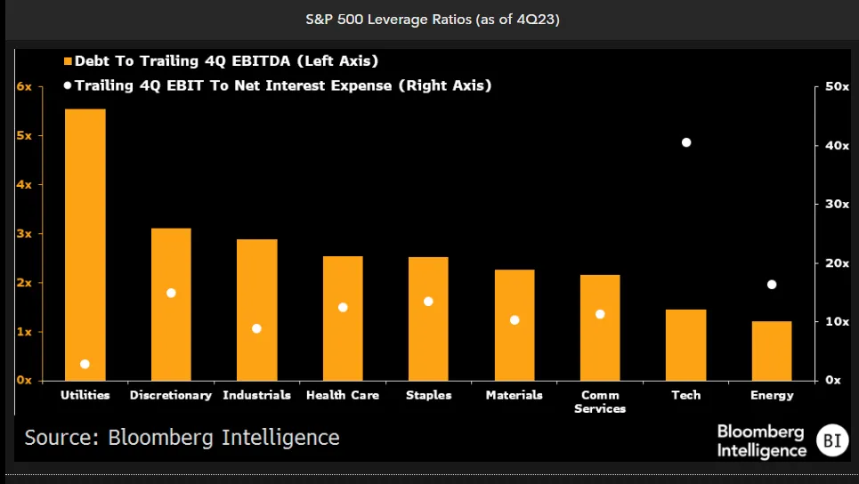 “虽然科技股相对于市场其他部分具有高于平均水平和中位数的久期,但该组的债务相对较少,并且维持着远高于指数其他行业的利息覆盖比率,”他们指出。
