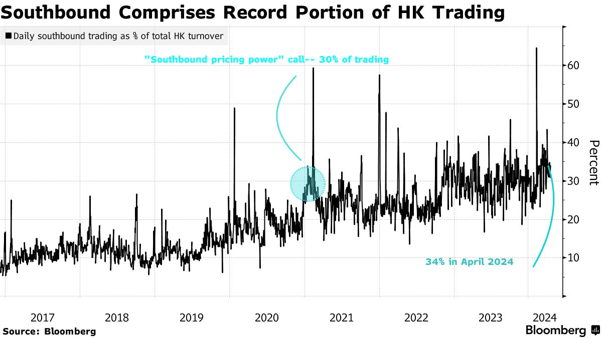 内地交易者的日益参与表明他们对香港股市的影响力日益增强,并可能帮助他们实现近年来一直渴望的目标。虽然 恒生指数 从2021年的高点下跌了近50%,但在这段期间,南向净购买额约为9900亿港元(约合1260亿美元)。