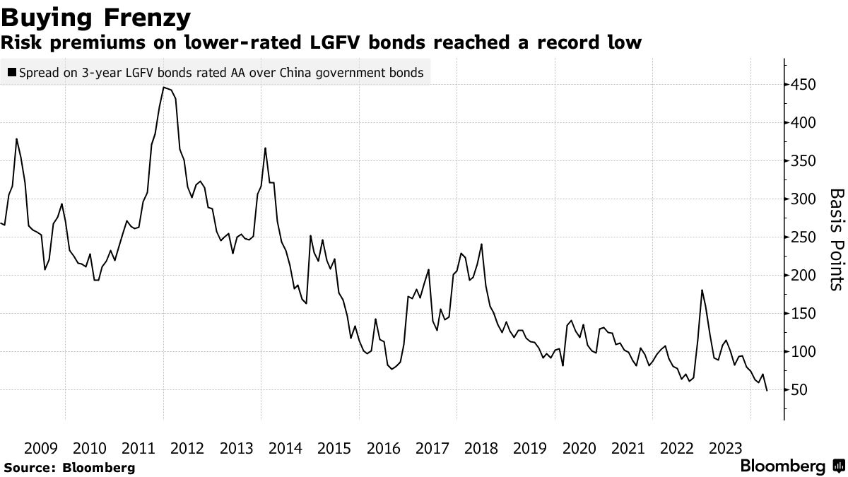 中国的地方政府隐性债务市场已经转变。仅仅几个月前,该行业被标记为亚洲的头号金融风险,但现在借款成本已降至创纪录低点,因为投资者对当局将会挽救遇到麻烦的任何运营感到信心。