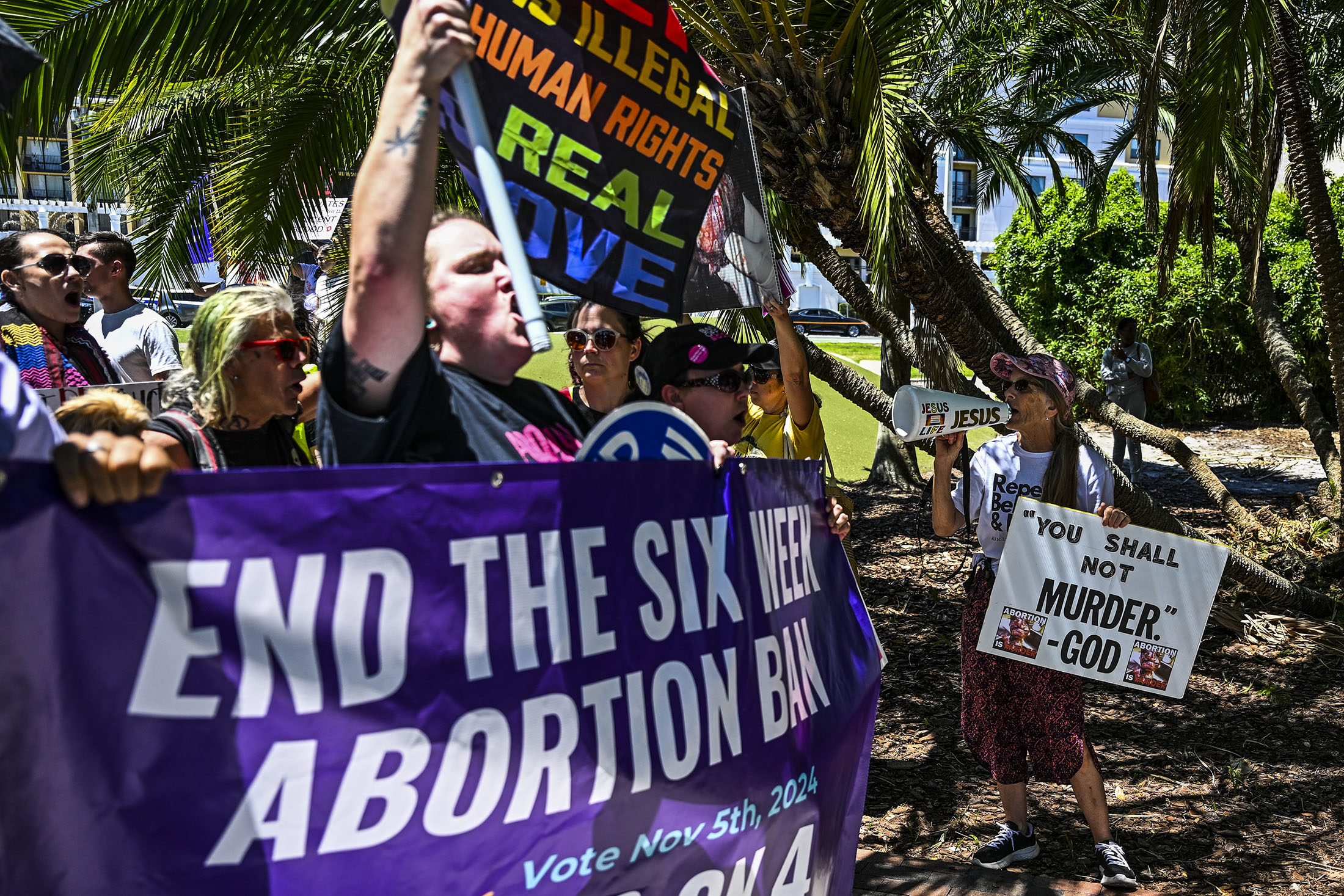 反堕胎活动人士在佛罗里达奥兰多举行的支持堕胎权集会附近抗议,4月13日。摄影师:Chandan Khanna/AFP/Getty Images