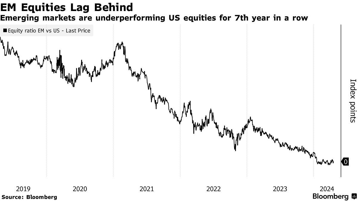 这一建议是在新兴市场股票连续第七年落后于美国同行之际提出的。截至2024年,新兴市场发展国家的MSCI指数已经下跌了近2%,而标普500指数则上涨了超过4%。