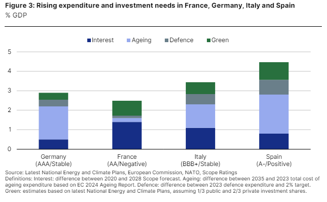 该公司周二发布了一份报告,指出财政压力正在增加,背景是低迷的增长和更高的借贷成本。根据其计算,法国、意大利、德国和西班牙将在2028年支付的利息比2020年多了近1700亿欧元(1810亿美元)。