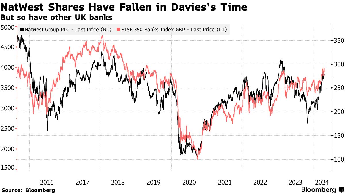 在戴维斯任内,NatWest的股价下跌了大约五分之一,尽管这反映了英国银行股普遍面临的困难时期 — 这是主席提出的问题,他认为金融健康是国家利益的一部分。