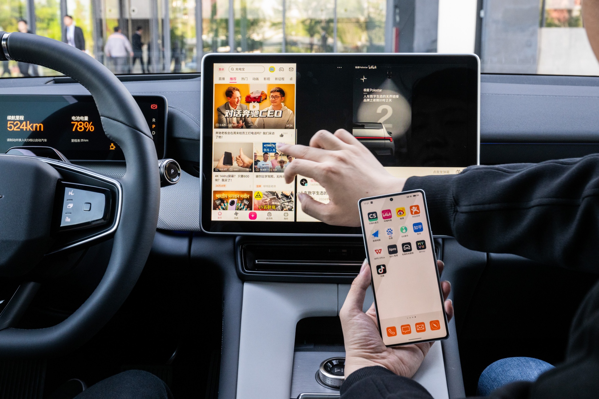 4月23日,北京,一部Polestar 4 SUV中的Polestar智能手机。来源:彭博社首先,中国汽车制造商Nio Inc. 发布了一款智能手机。然后科技巨头小米集团 推出了一款电动汽车。