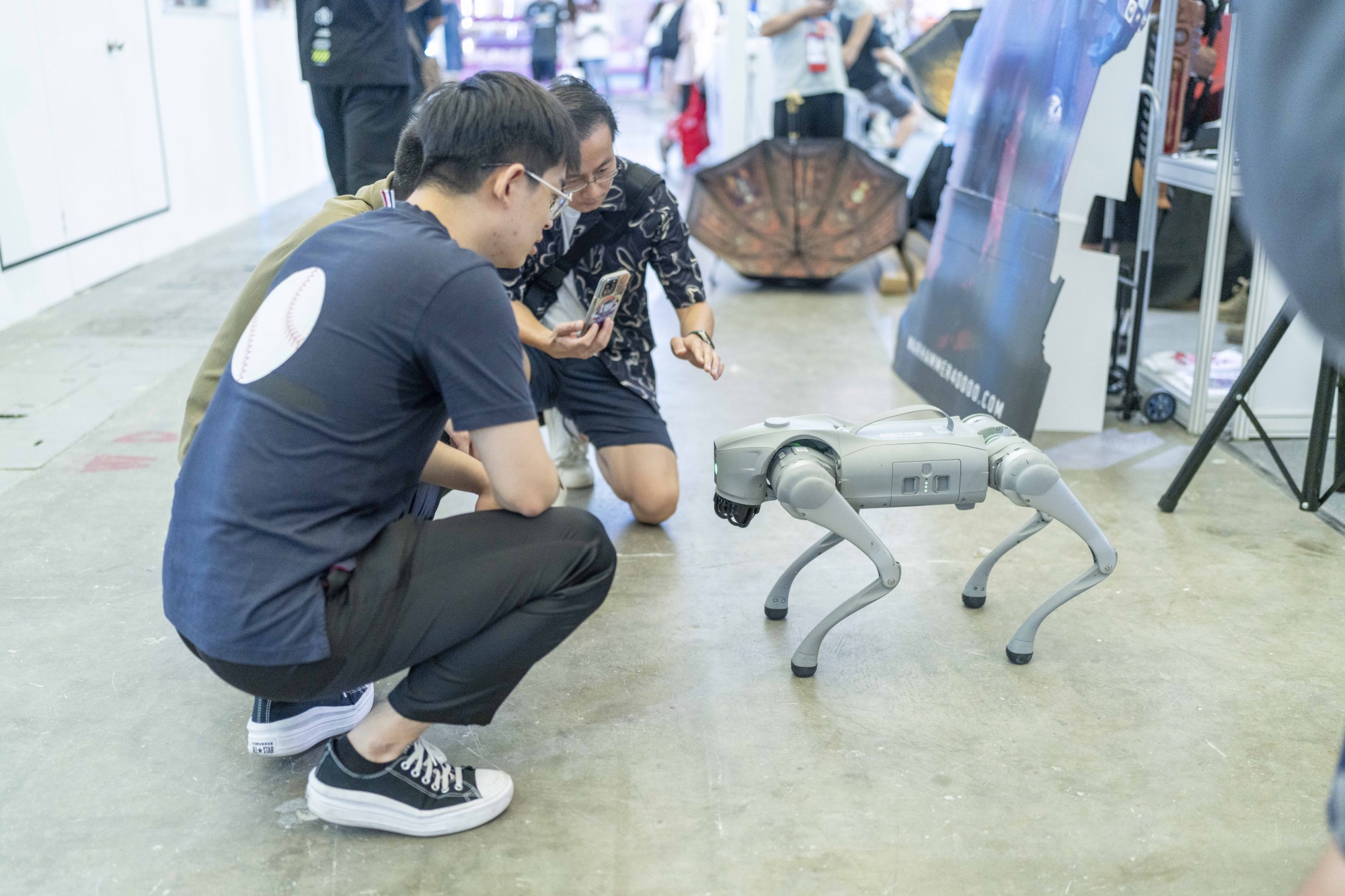 与华为技术有限公司展台上的Unitree Go2机器狗互动的参会者。