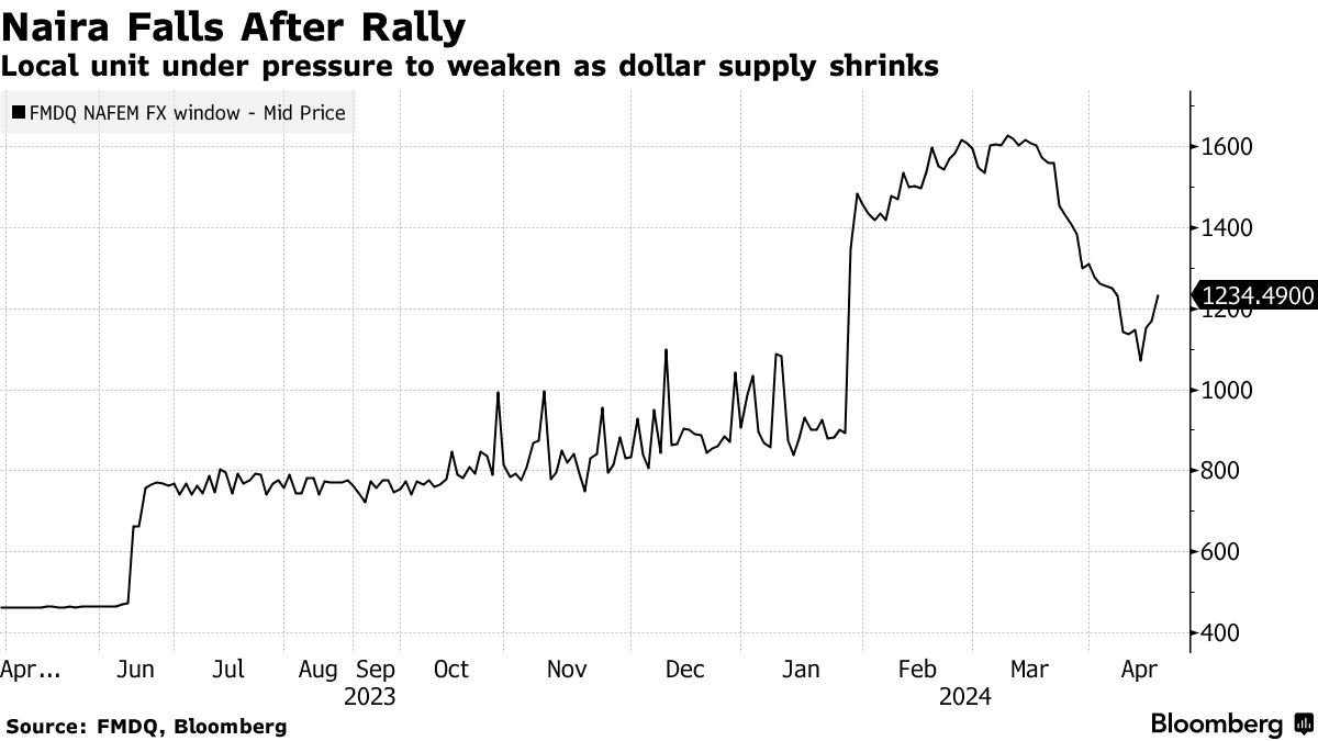 周一,本地货币兑美元下跌了5.3%,中止了一段时间内曾使其成为全球表现最佳货币的表现,据总部位于拉各斯的 FMDQ 称,在非官方市场上,尼拉下跌了6%,延续了过去三个交易日的下跌趋势,Forward Marketing Bureau de Change Ltd.首席执行官阿布巴卡尔·穆罕默德表示,该公司追踪商业首都的数据。