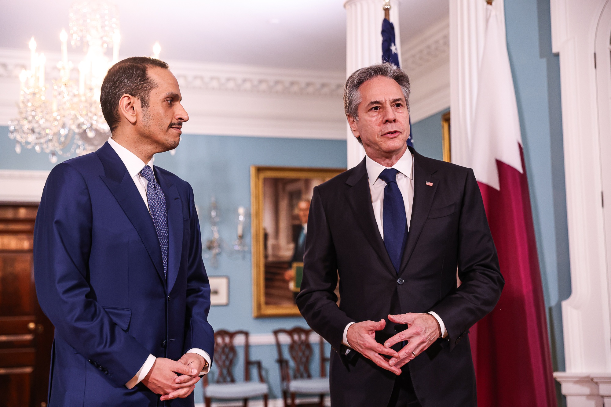 安东尼·布林肯,美国国务卿,右,和卡塔尔总理穆罕默德·本·阿卜杜勒拉赫曼·本·贾西姆·阿勒萨尼,在美国华盛顿特区的美国国务院会晤,日期为2024年3月5日。布林肯表示,哈马斯必须决定是否同意停火,因为以色列-哈马斯战争进入第五个月。摄影师:瓦莱丽·普莱什/彭博社 收听Big Take播客,iHeart,Apple Podcasts,Spotify和彭博终端。