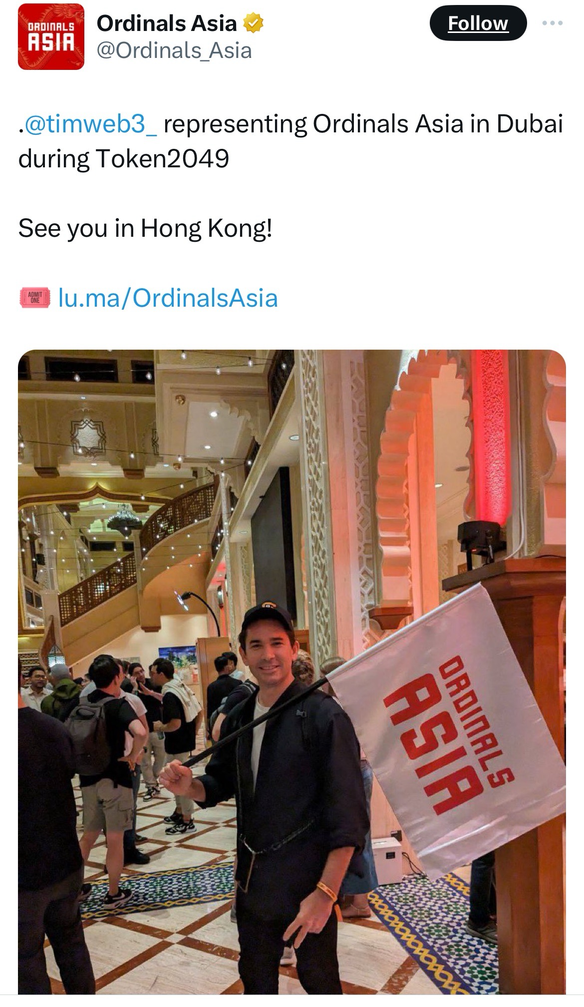 来源: @Ordinals_Asia](https://twitter.com/Ordinals_Asia/status/1780189094112624922)在迪拜举办的Token2049首秀期间,也在新加坡举办的一场会议中,币安首席执行官Richard Teng确认该交易所已从该城市获得了完整的加密货币许可证,这是在美国因反洗钱和违反制裁而支付43亿美元和Changpeng“CZ” Zhao辞去首席执行官职务之后,该交易所努力变得更加规范的证明。然而,迪拜对这一行业的拥抱并不意味着不良行为不会被注意到。该酋长国的监管机构已对BitOasis和OPNX等加密货币公司采取了执法行动,后者是与声名狼藉的加密货币对冲基金Three Arrows Capital的创始人有关的破产索赔交易所。