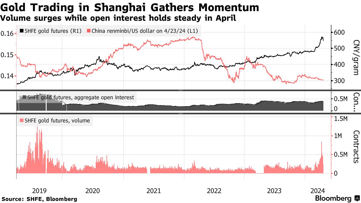 金价今年飙升,从3月初的每盎司2000美元以上,面对通常情况下会限制涨幅的重大压力。这些压力包括美联储降息预期减弱、较高的国债收益率和美元走强。除此之外,印度这个第二大消费国出现了虚拟的买家罢工,西方基金对黄金不感兴趣,交易所交易基金出现净卖出。然而,上期所的交易量开始激增,价格也一路飙升。