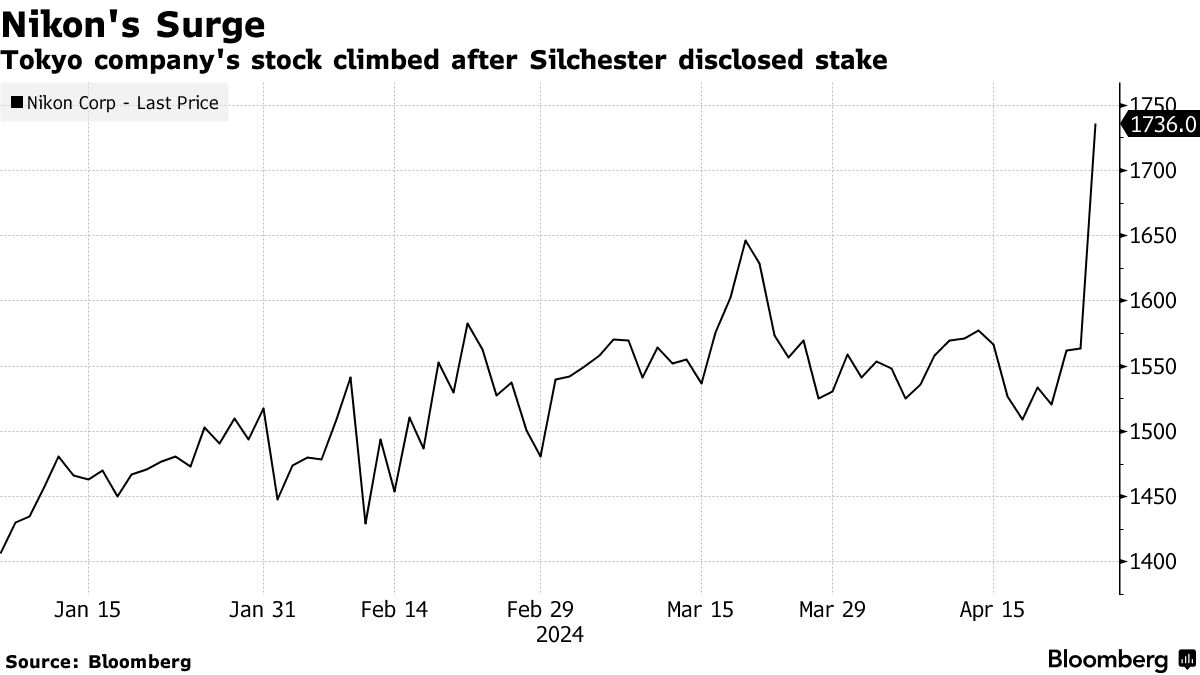 Silchester报告称,他们持有这家总部位于东京的公司5%的股份,并表示可能要求增加股息、股票回购或其他资本政策变更,根据向日本财务省提交的文件。尼康的股价一度上涨了多达11%,创下自2021年5月以来的最大涨幅。