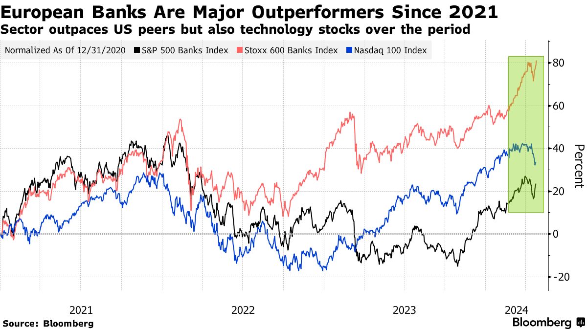 自2020年底以来,欧洲 Stoxx 600 银行指数涨幅达到82%,超过了美国科技股和美国贷款机构,像瑞银集团、德意志银行和桑坦德银行等银行最近创下了多年来的高点。根据贝伦贝格策略师的说法,欧洲银行是欧洲或美国唯一一个自2021年以来每年表现优异的行业,今年迄今为止也是如此。