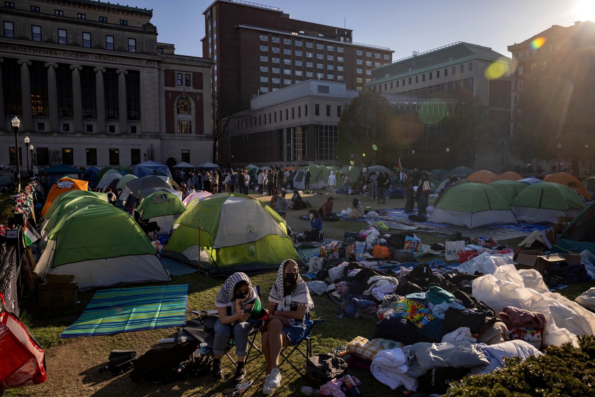 纽约哥伦比亚大学的亲巴勒斯坦示威者,时间是4月24日。摄影师:岩村由纪/彭博社这些抗议活动横跨从密歇根大学到加州大学伯克利分校的多所大学,主要呼吁学校切断与以色列有关公司的财务联系,要求美国停止军事援助,以及要求学校管理层停止对学生采取纪律行动。