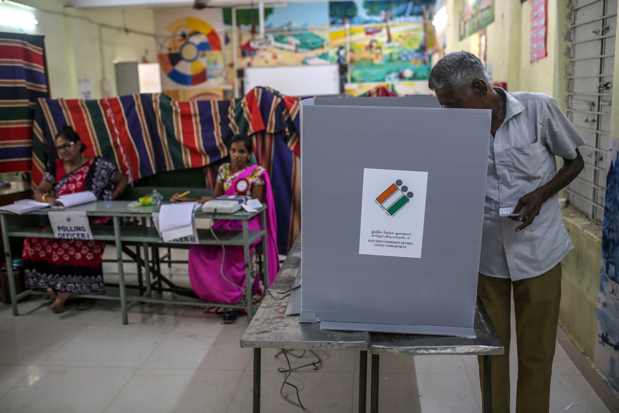 一名选民在4月19日在金奈的一个投票站投票,这是全国选举的第一阶段。