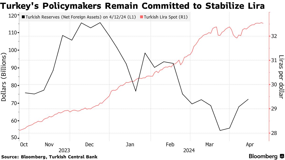 HSBC的乌尔根表示,通胀率今年可能降至40%,并且在明年将减半。该银行预计里拉的贬值将受到控制,本季度将从周三的32.54降至每美元34左右。