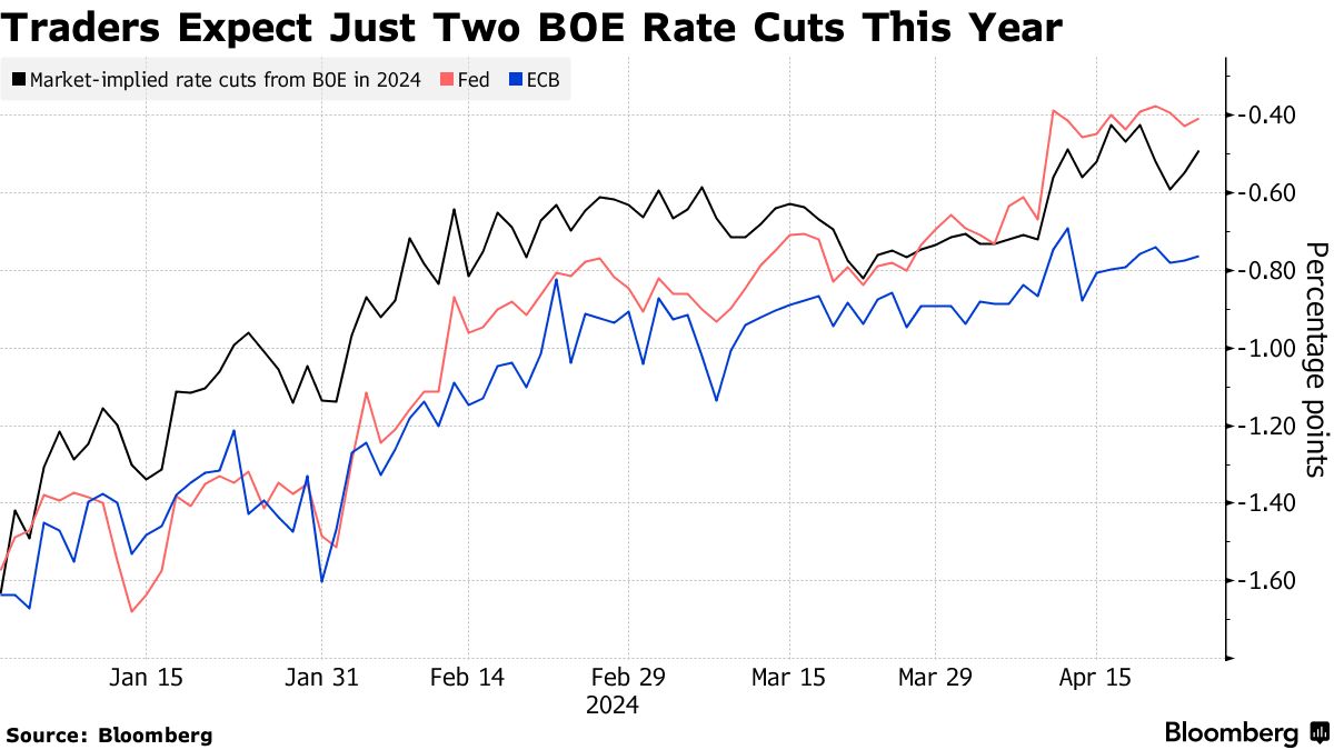 来源:彭博经济学。注:情景假设使用彭博经济学对家庭可支配收入的预测。房价假定在每种情景下保持不变。交易员们在今年年初曾预计2024年将会有多达六次四分之一的降息,但如今在英国央行政策制定者警告持续的价格压力,以及英国和美国的通胀数据高于预期后,他们现在只预计会有两次降息。