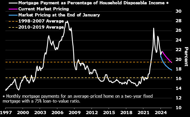 较高的抵押贷款利率可能使许多人无法购买房屋。即使价格保持不变,家庭仍将花费比2007年以前十年更高比例的收入用于抵押贷款支付,彭博经济学计算出来的。这与今年早些时候的情况形成鲜明对比,当时这一指标预计将降至金融危机前的水平以下。