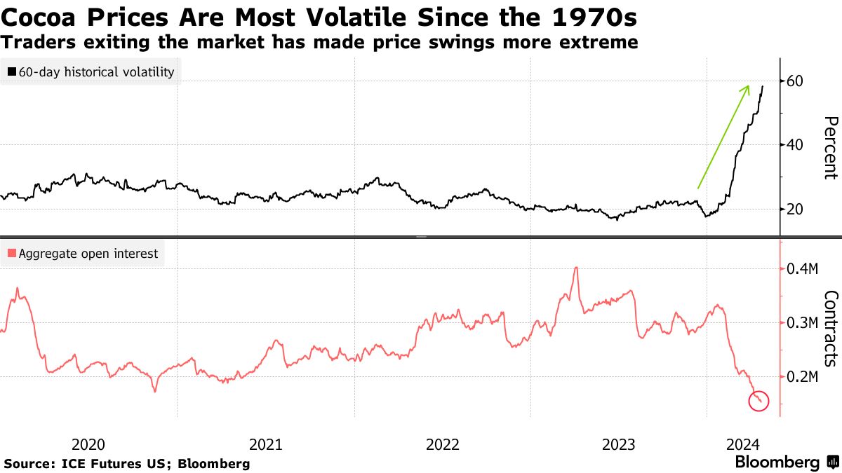周三可可价格飙升了高达4.5%,结束了近9%的两天下跌。这有助于将60天的波动率指标推高至1977年以来的最高水平。