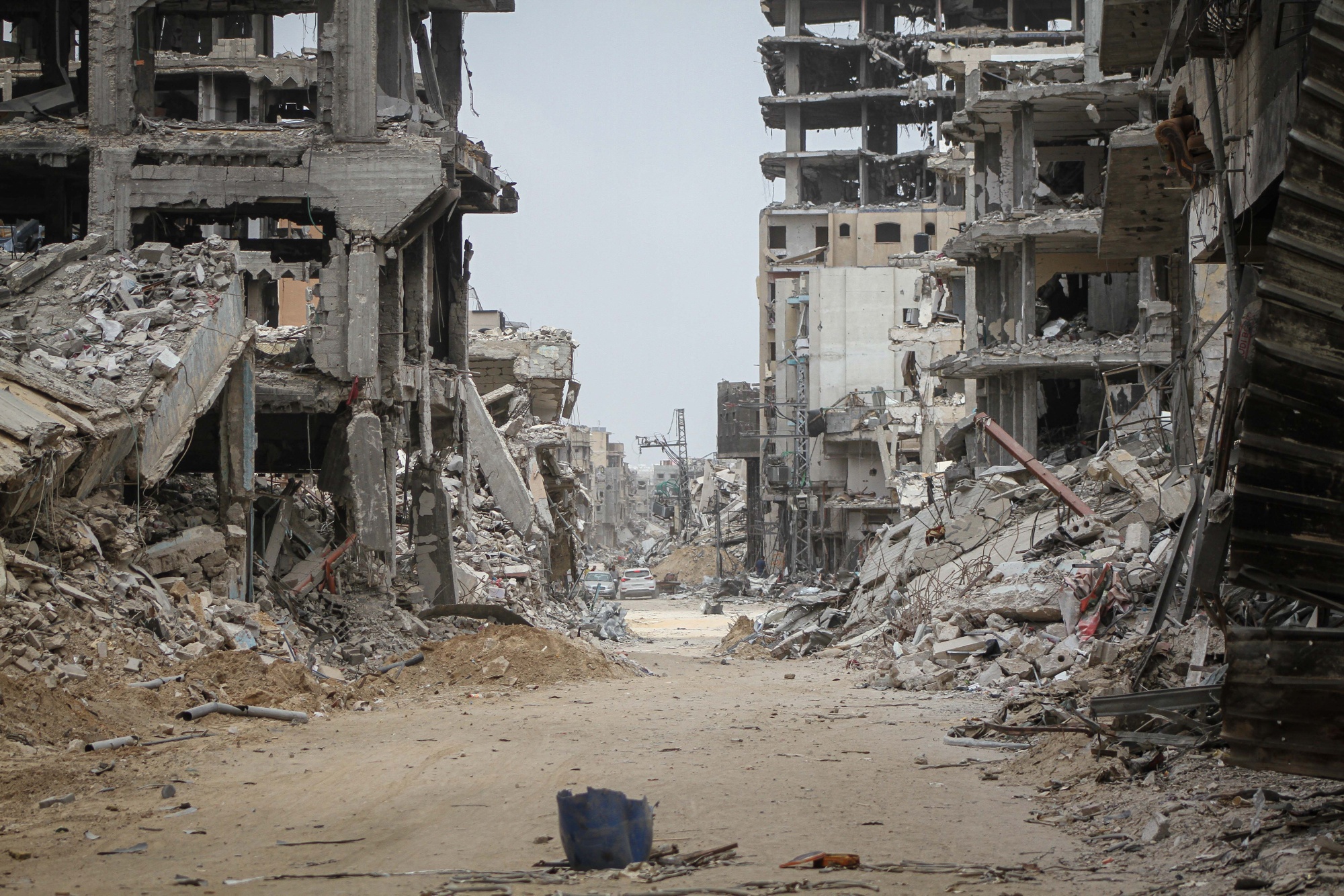 4月26日,加沙南部汗尤尼斯市一条被摧毁建筑物围绕的道路。