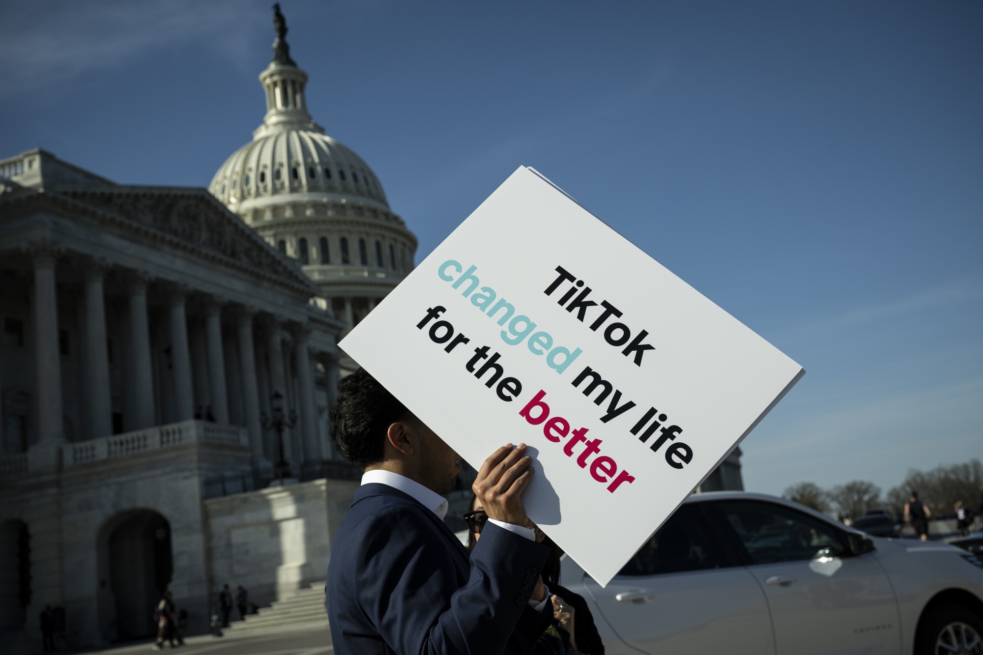 一名倡导者在华盛顿美国国会外举着一块写有TikTok字样的标牌。