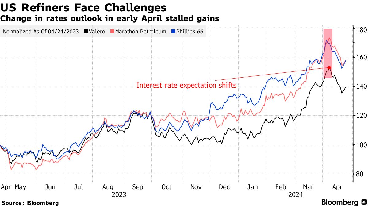 马拉松在年初的头几周上涨了高达48%,瓦莱罗和菲利普斯分别紧随其后上涨了41%和30%。但在4月初,随着利率预期从乐观转向担忧,引发了对经济增长和支撑其的能源需求的担忧,一切都发生了变化。
