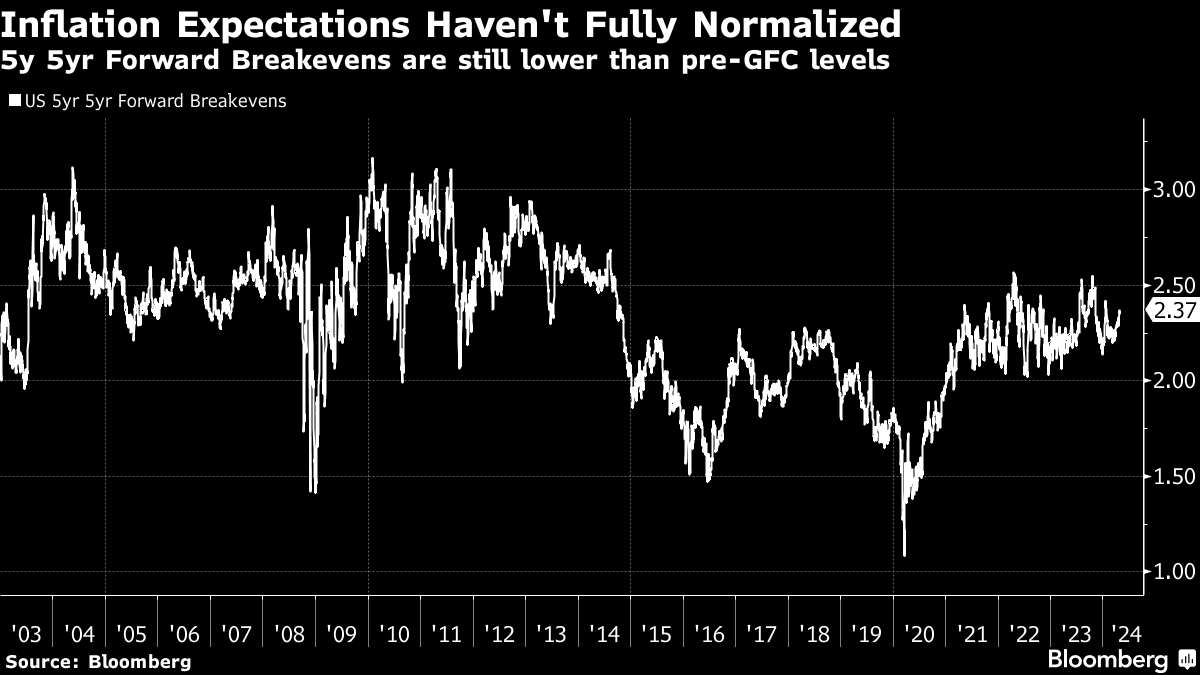 例如,如果你看一下未来10年的通货膨胀预期 — 使用所谓的5年5年期前瞻性通胀预期,这是衡量市场对未来5年通货膨胀预期的指标 — 你会发现我们还没有‘正常化’。