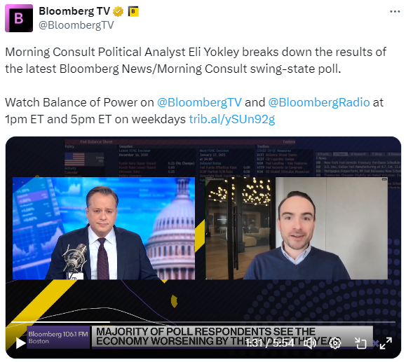 今天在彭博电视台的权力平衡早间版节目中,主持人乔·马修和凯莉·莱因兹采访了晨间咨询公司的政治分析师伊莱·约克利,谈论了最新彭博新闻/晨间咨询摇摆州民调的结果。