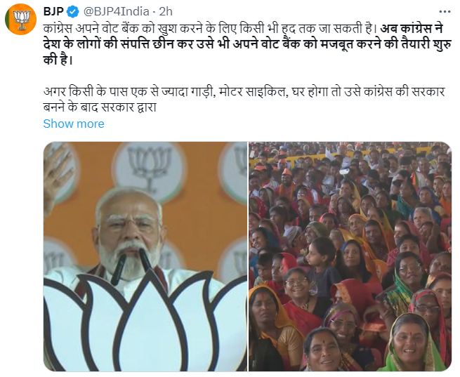 国大党打算夺取人民的财富以取悦其选民群体,人民党在X上声称。(粗略翻译)随着政治温度的上升,选民可能会得到一些缓解。气象部门表示,在这次七阶段选举中的第二个投票日4月26日,没有发生热浪的主要可能性。没有主要热浪可能性。