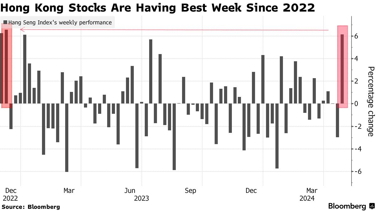 基准恒生指数本周上涨超过6%,创下自2022年12月以来的最佳表现。内地投资者通过与香港的交易通道连续19个交易日净买入股票。