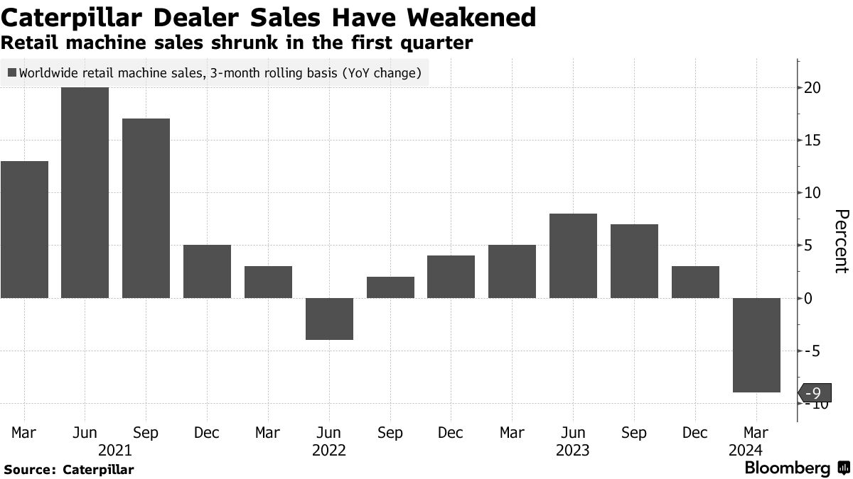 卡特彼勒公司股价在纽约下跌了多达9.1%,为四年来最大的单日跌幅,重型设备制造商在其财报中表示,预计第二季度销售额将低于去年同期。尽管该公司公布的调整后利润超过了分析师的预期,但其关键的建筑和资源行业部门的销售下降,整体收入在北美以外继续显示疲软。