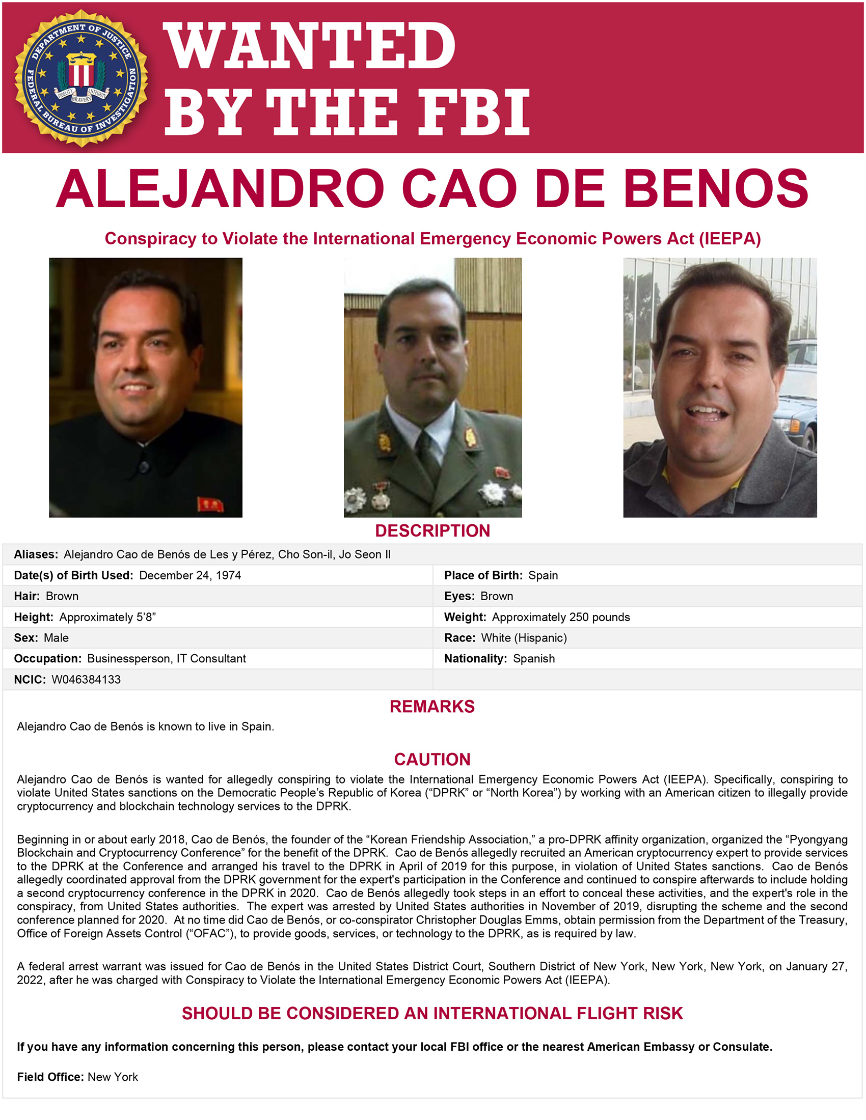 在我们报道的前一年左右,他组织了朝鲜的首次加密货币会议。(我们写道,“对于一个被全球银行系统放逐的国家来说,加密货币显然具有吸引力。”)在这样做的过程中,他触犯了美国当局,他们表示Cao de Benós与一名美国加密研究人员共谋违反制裁。FBI希望引渡他,2023年底,西班牙警方在他在马德里下火车后逮捕了他。一名法官在无条件释放他,等待引渡。
