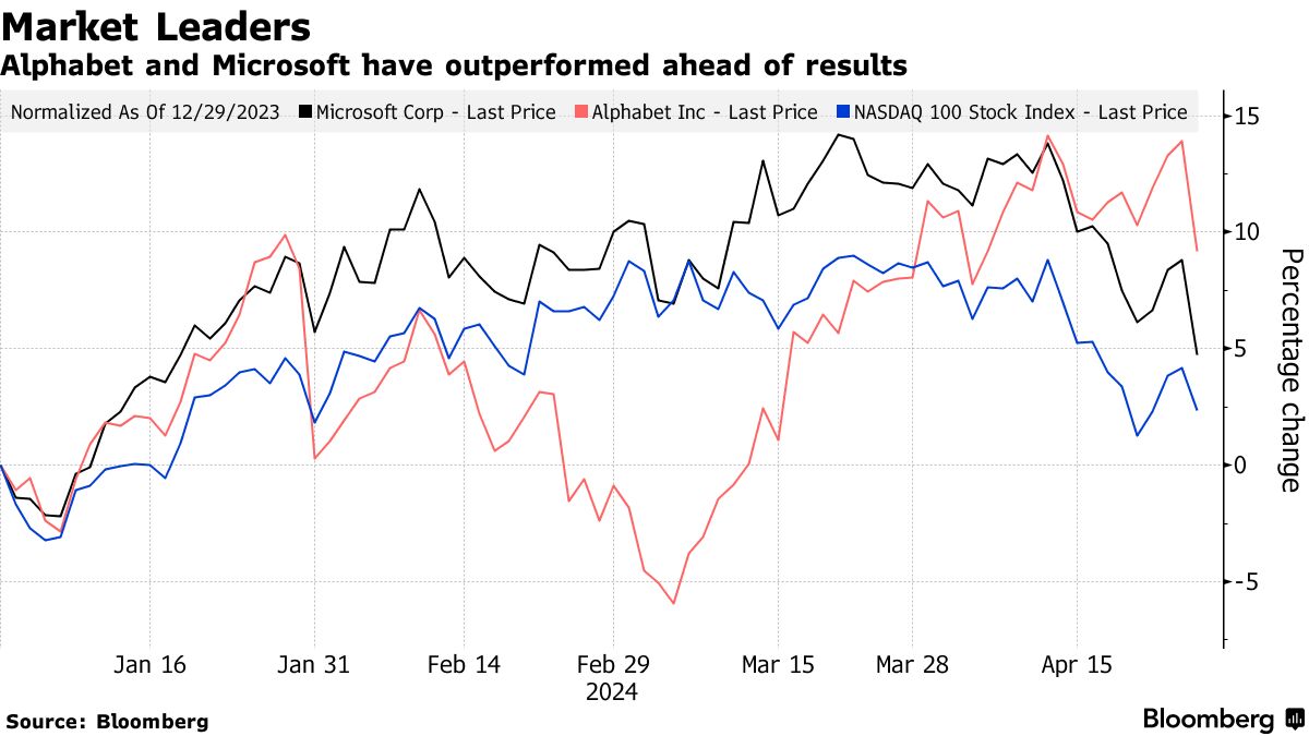 “对微软和谷歌母公司Alphabet来说,这是一个展示季,也是人工智能的展示季,” State Street Global Advisors的首席投资策略师Michael Arone说。“它们的股价反映了一个完美的环境,这一次,稍微超过预期不够。它们需要展示他们有能力超越甚至是高企的预期。这对市场重建其动力至关重要。”