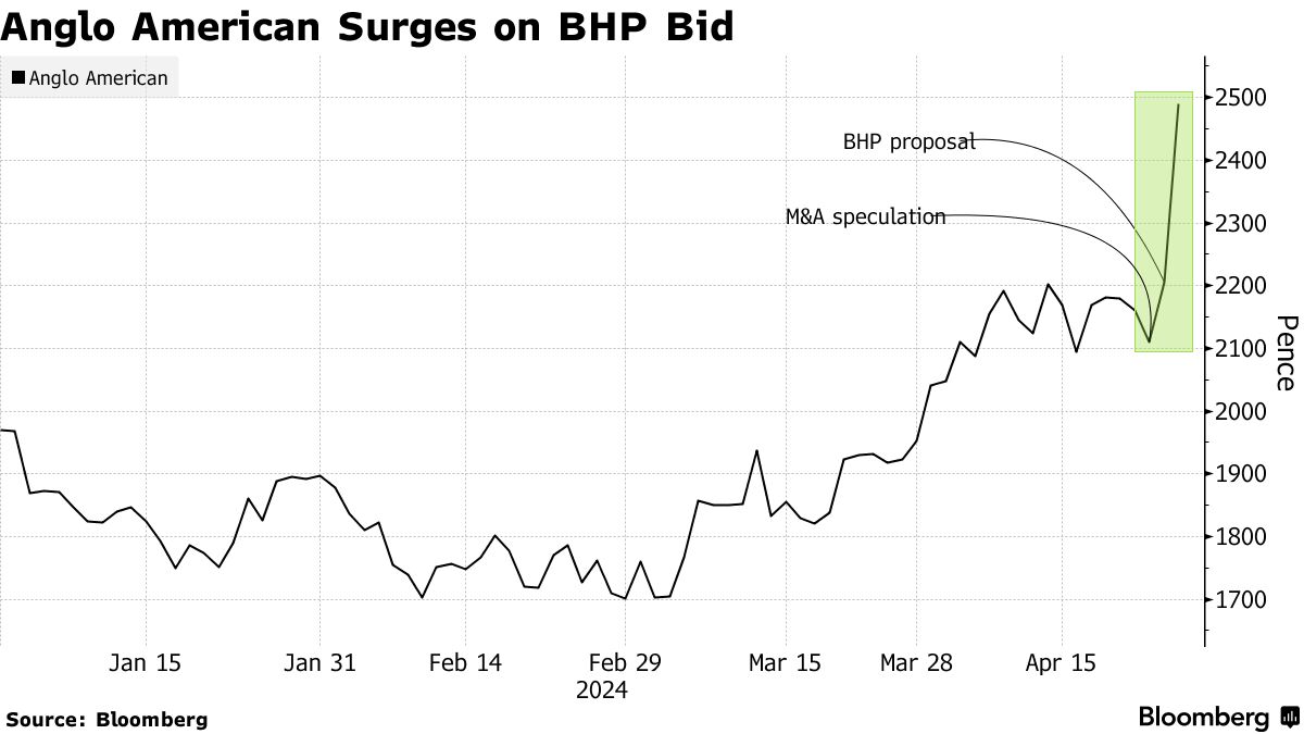 来源:英美资源公司交易商们正在推动英美资源公司的股价超过BHP集团有限公司的收购提议价值,这表明他们预计收购者或闯入者会提出更高的出价。